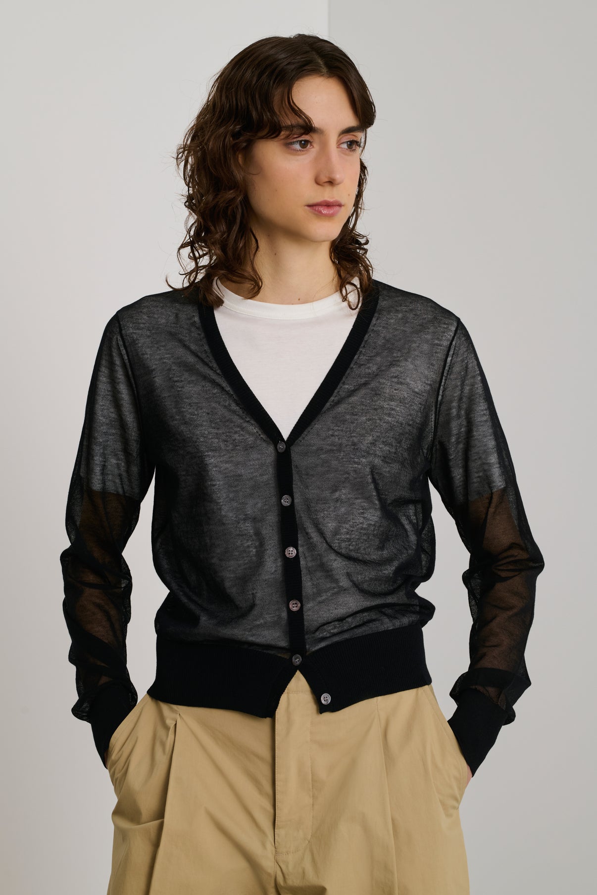 ETRETAT is a cardigan knitted in ultra-fine yarn. It can be worn directly on the skin or layered for transparency effects. Versatile, it can be dressed up or casual.