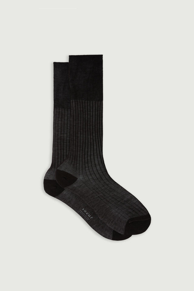 BACH is a pair of extra-fine socks, semi-sheer like silk, distinguished by a high cut and elegant ribbed design. Ideal worn scrunched at the ankle with low shoes.