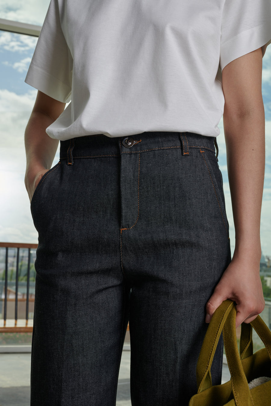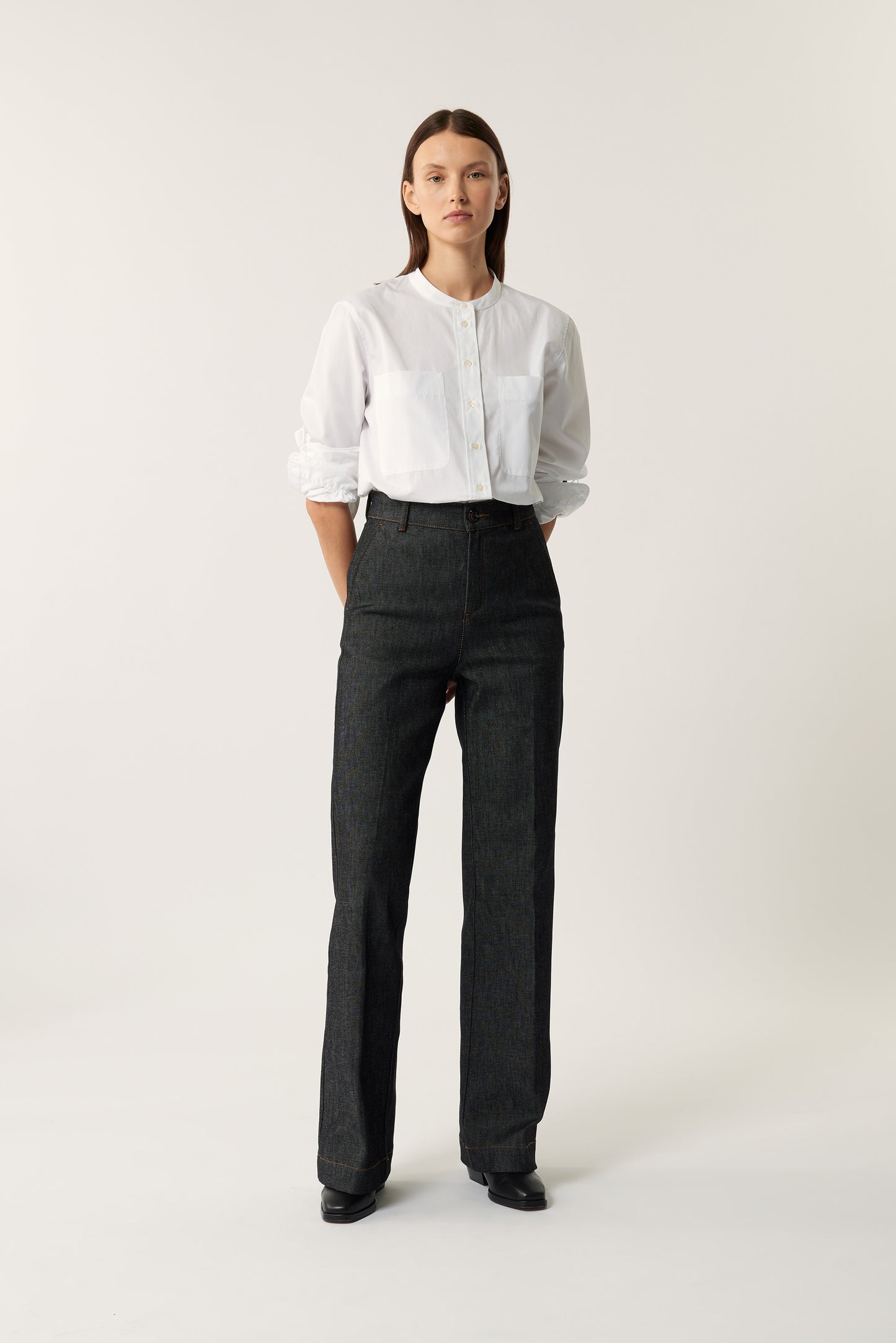 CALIFORNIA is a timeless, iconic Soeur jean, with a wide flared cut. Its high waist perfects a feminine and elongated look. This version in raw, thick, durable denim ensures structure and impeccable drape.