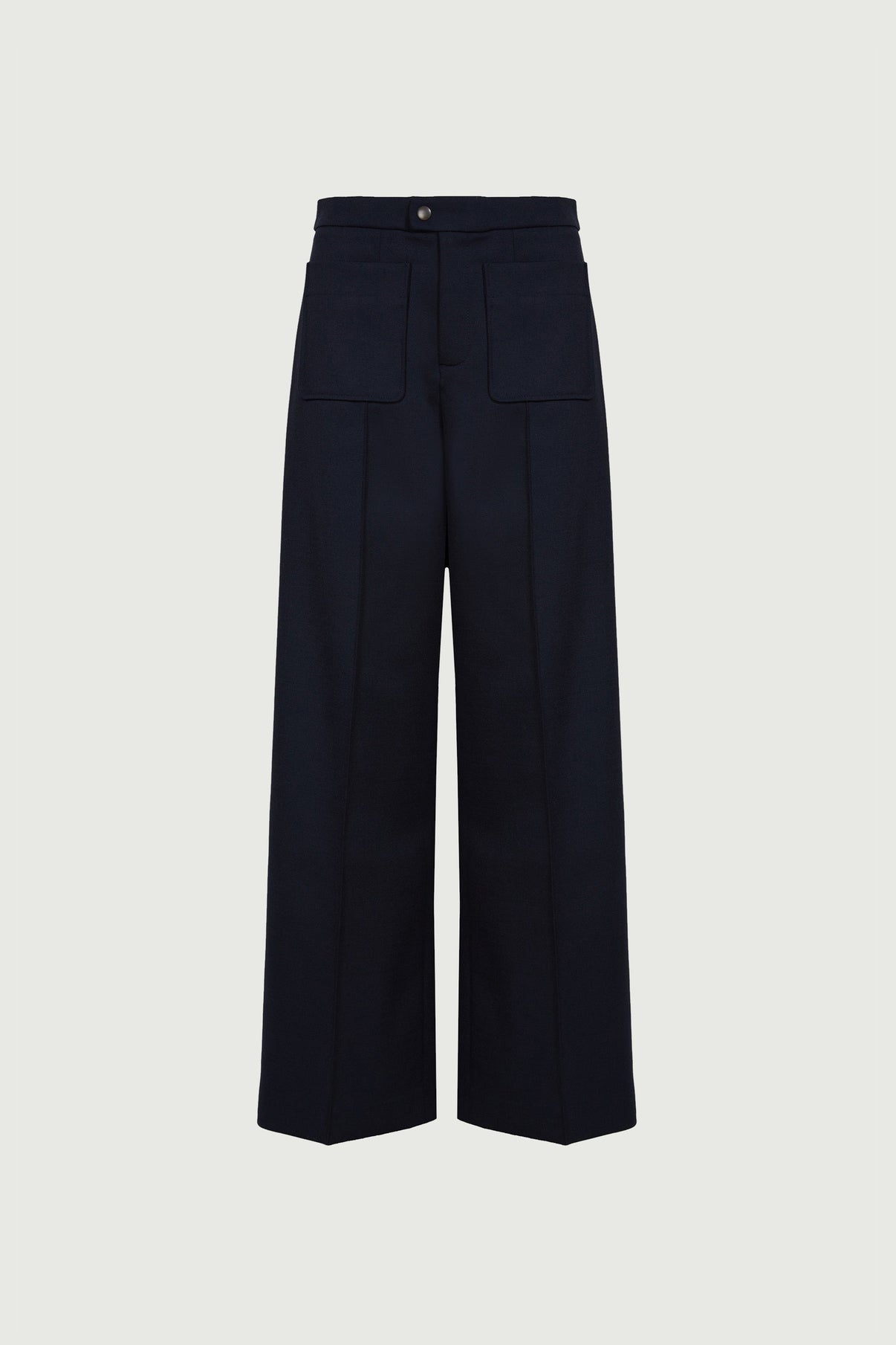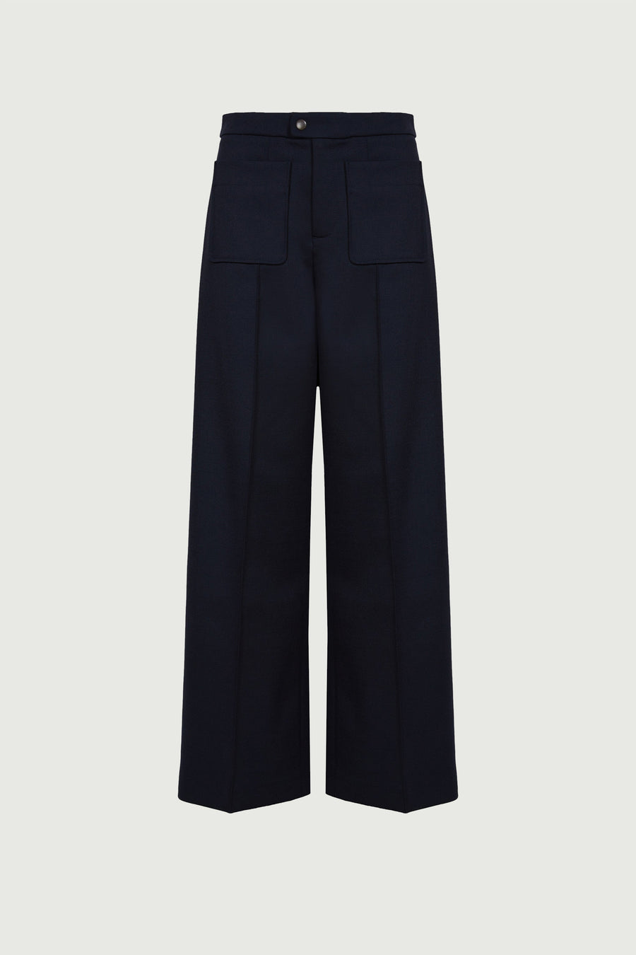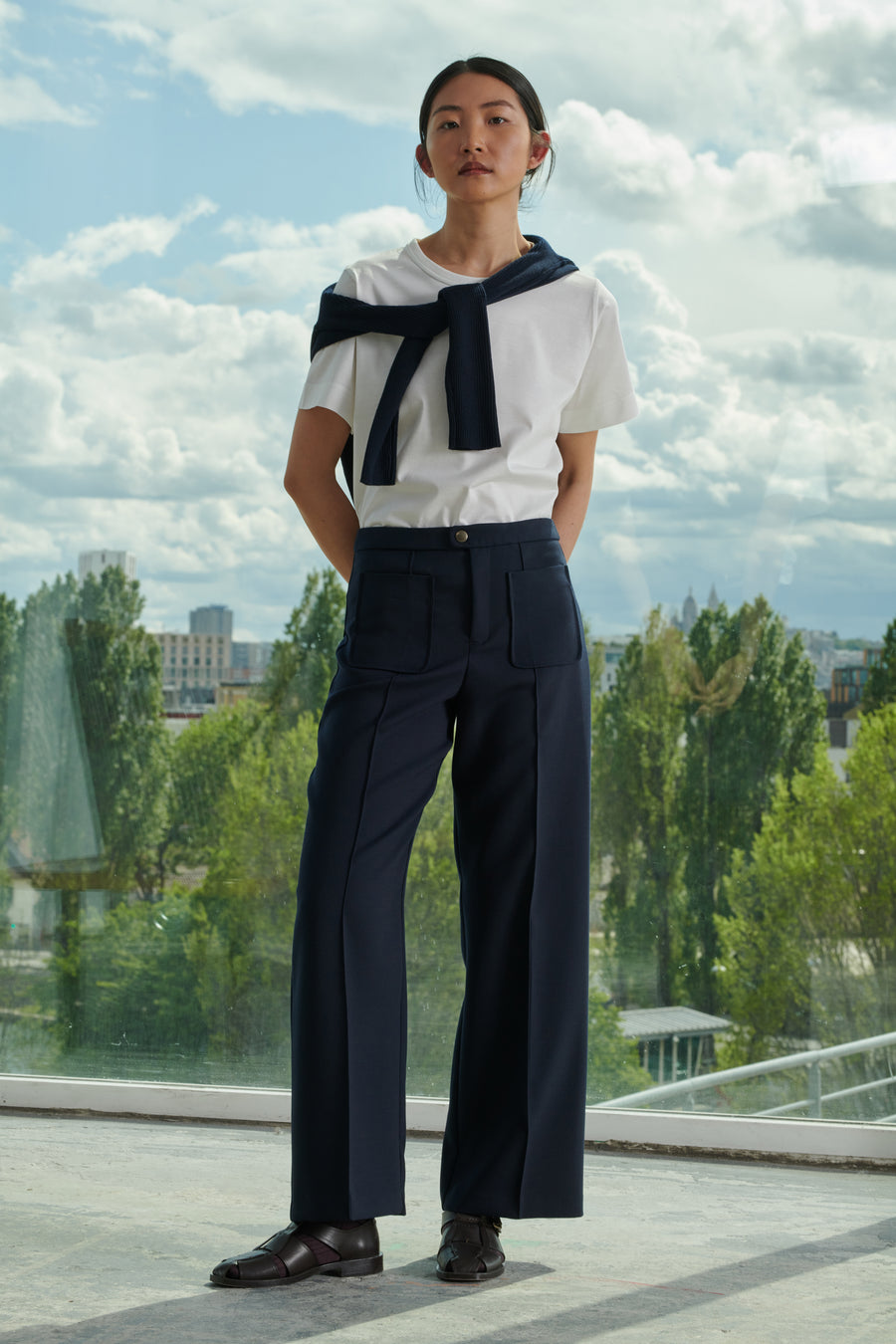 HARRY is an iconic Soeur trouser, recognisable by patch pockets at the front and back and a sharp crease along the leg. Suitable for all body types thanks to a slightly flared cut and 7/8 length that hangs above the ankle to elongate the silhouette. This version in soft wool provides structure and is particularly comfortable, ideal for everyday wear.