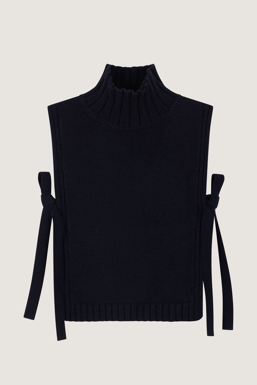 OR is our signature wool bib. The knit, compact and densely woven, provides structure and a high, straight stand-up collar that elongates the silhouette. Practical, it will warm up any outfit with style, without restricting arm movement when slipped under a jacket or coat.