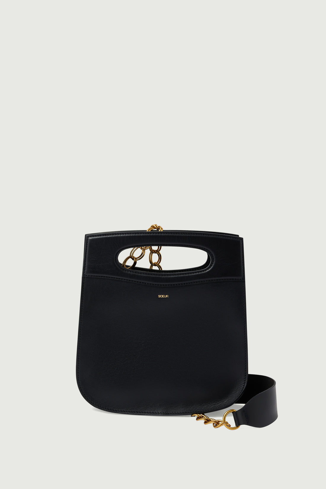 - Removable gold chain and leather strap