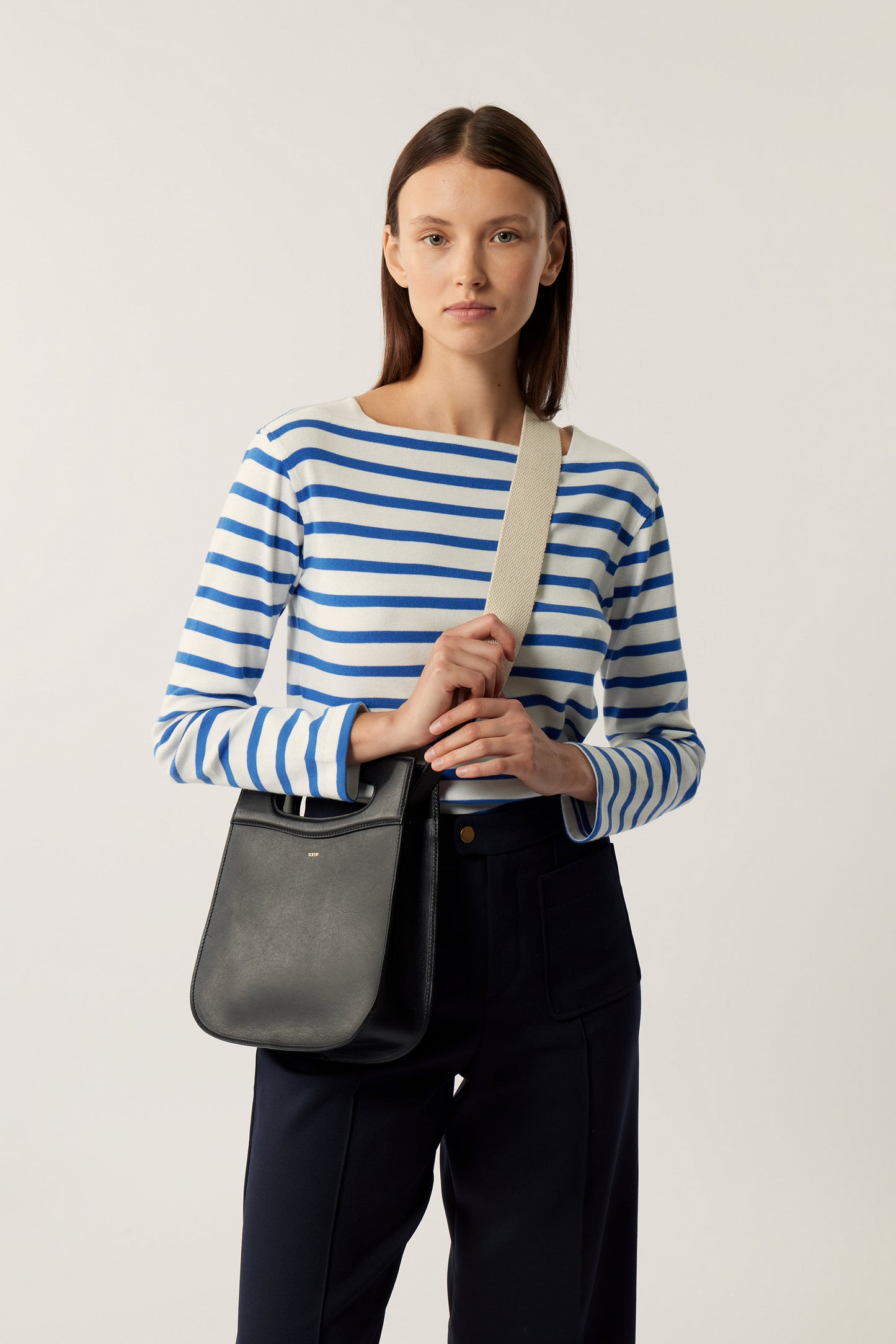 CHERI is one of our iconic bags, recognisable by its moulded oval handle. This bag is a daily companion, wearable by hand, over the shoulder, or crossbody. It has two removable and interchangeable straps: a gold chain with a leather patch, and a cotton strap of adjustable length.