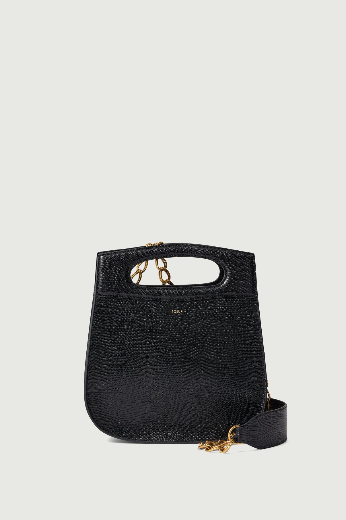 CHERI is our iconic bag. Recognisable by its moulded oval handle, this small, round bag is an everyday ally that can be carried by hand, on the shoulder or slung over the shoulder. It has two removable shoulder straps: one is a gold chain with a leather patch, and the other is a cotton shoulder strap.