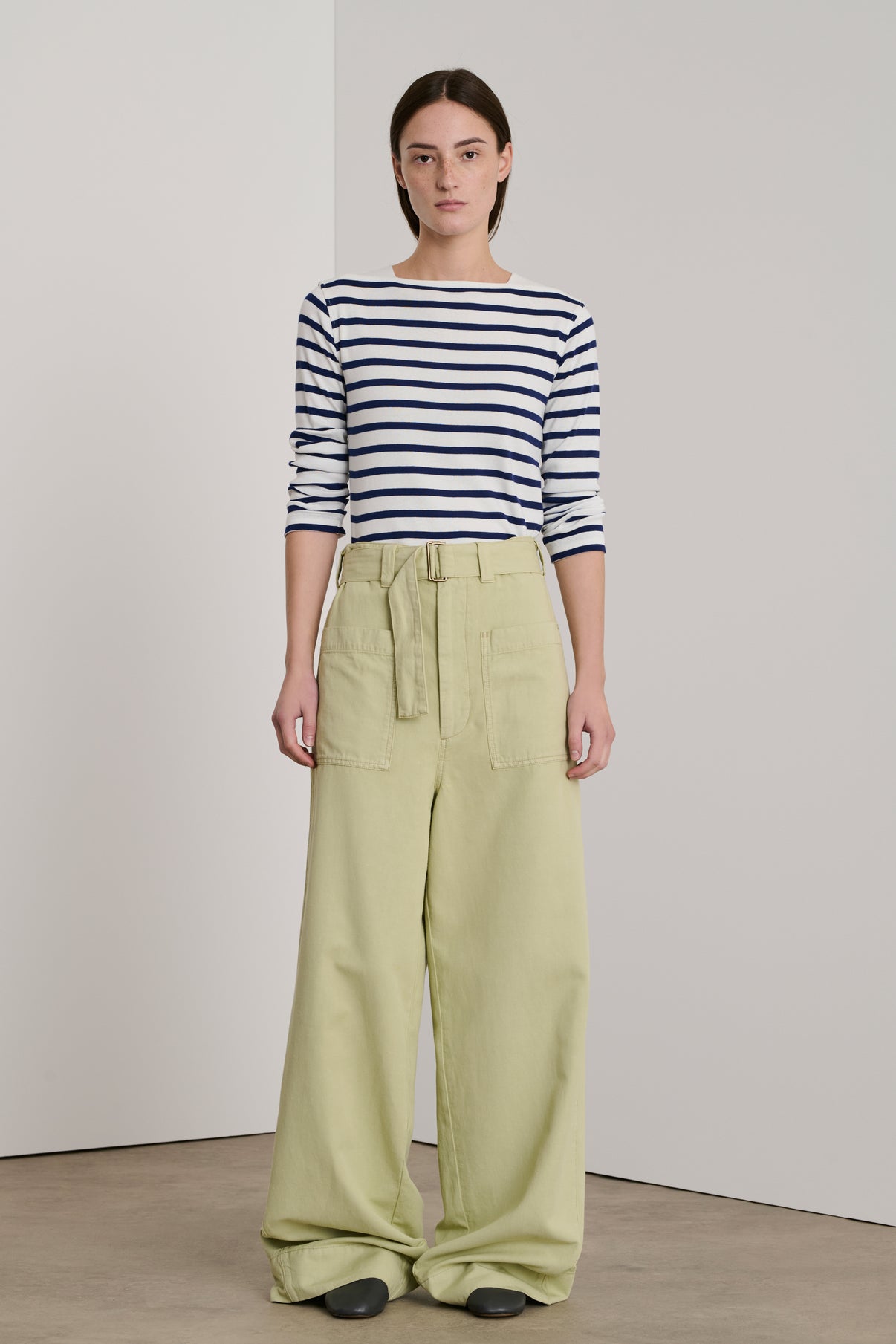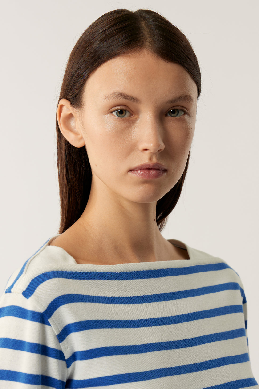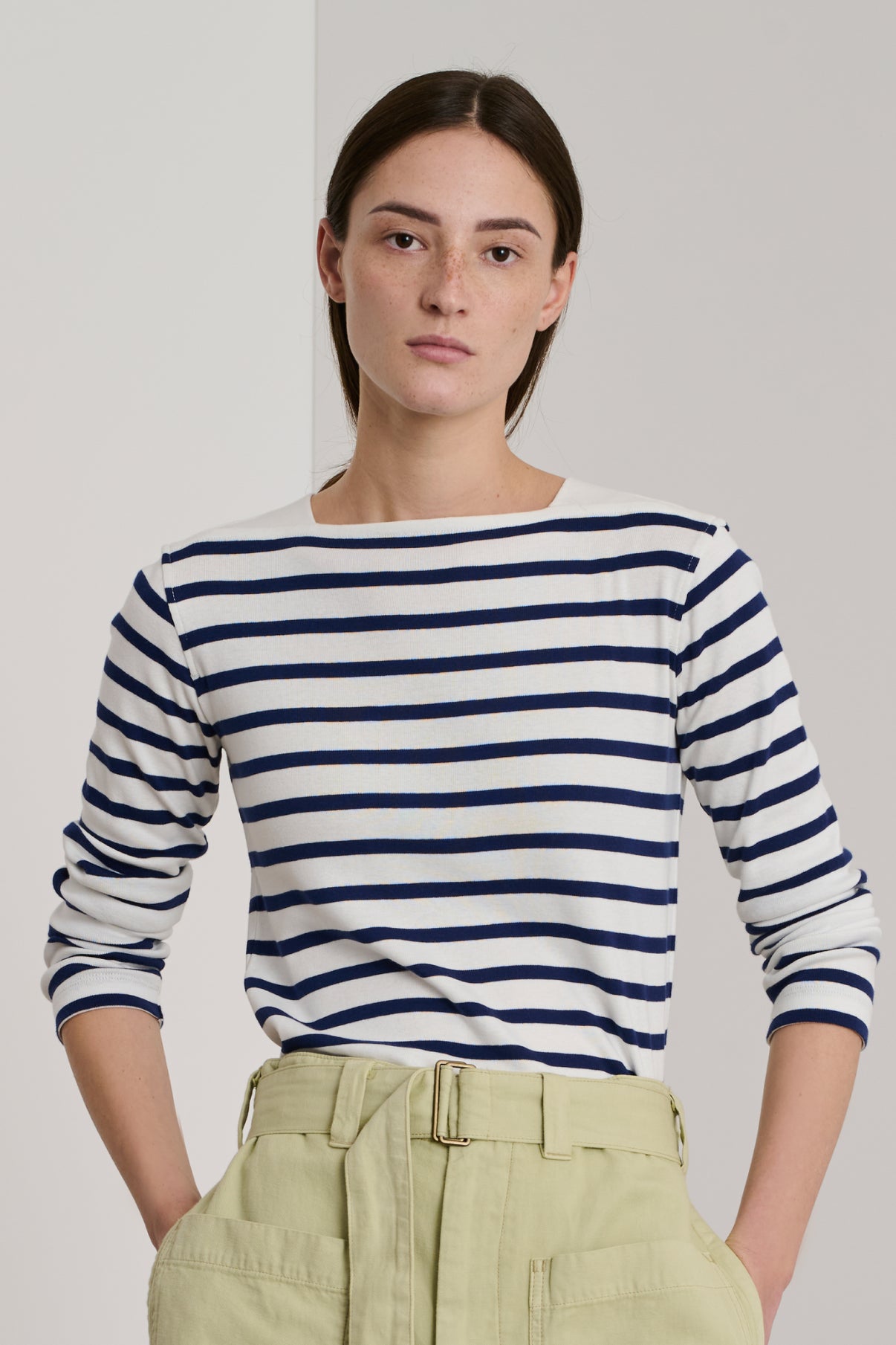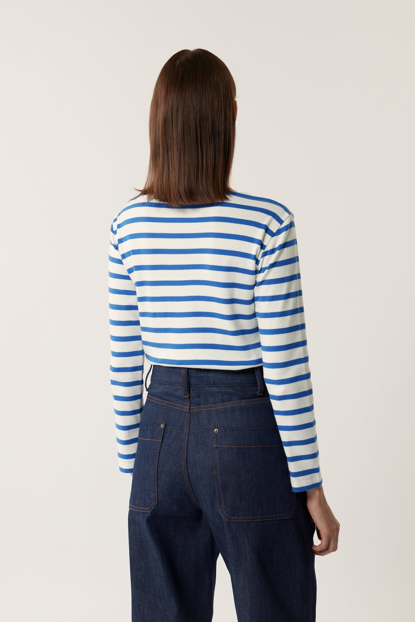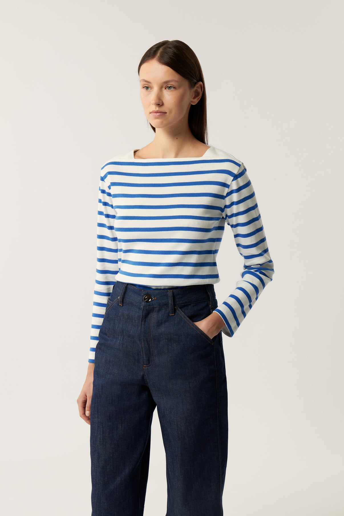 KATY is a white and navy-blue Breton top in cotton jersey. This classic stands out through Soeur’s signature details: a refined neckline (boat cut with gusset finishing), dense, structured cotton jersey, and organic cotton quality. A timeless wardrobe essential that is both comfortable and enduring.
