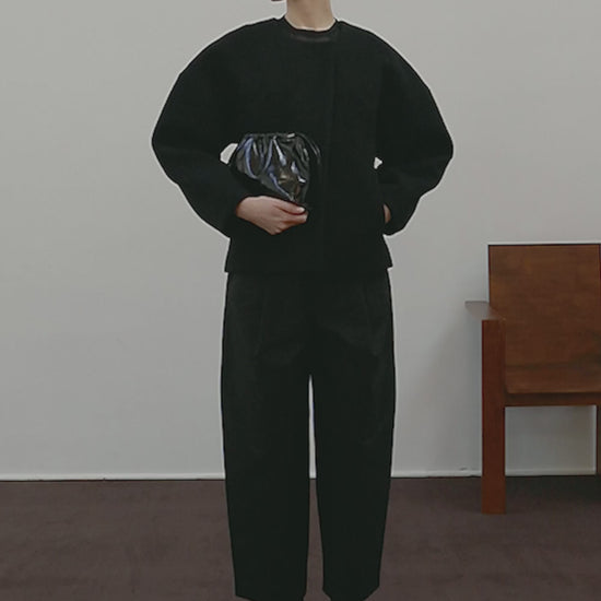 FRANCE is a short jacket in black boiled wool, tailored at the waist for an elegant silhouette. Its hip-length and round neckline give it a sophisticated look. The asymmetrical closure and pockets add refinement. Fully lined, it ensures warmth and comfort.