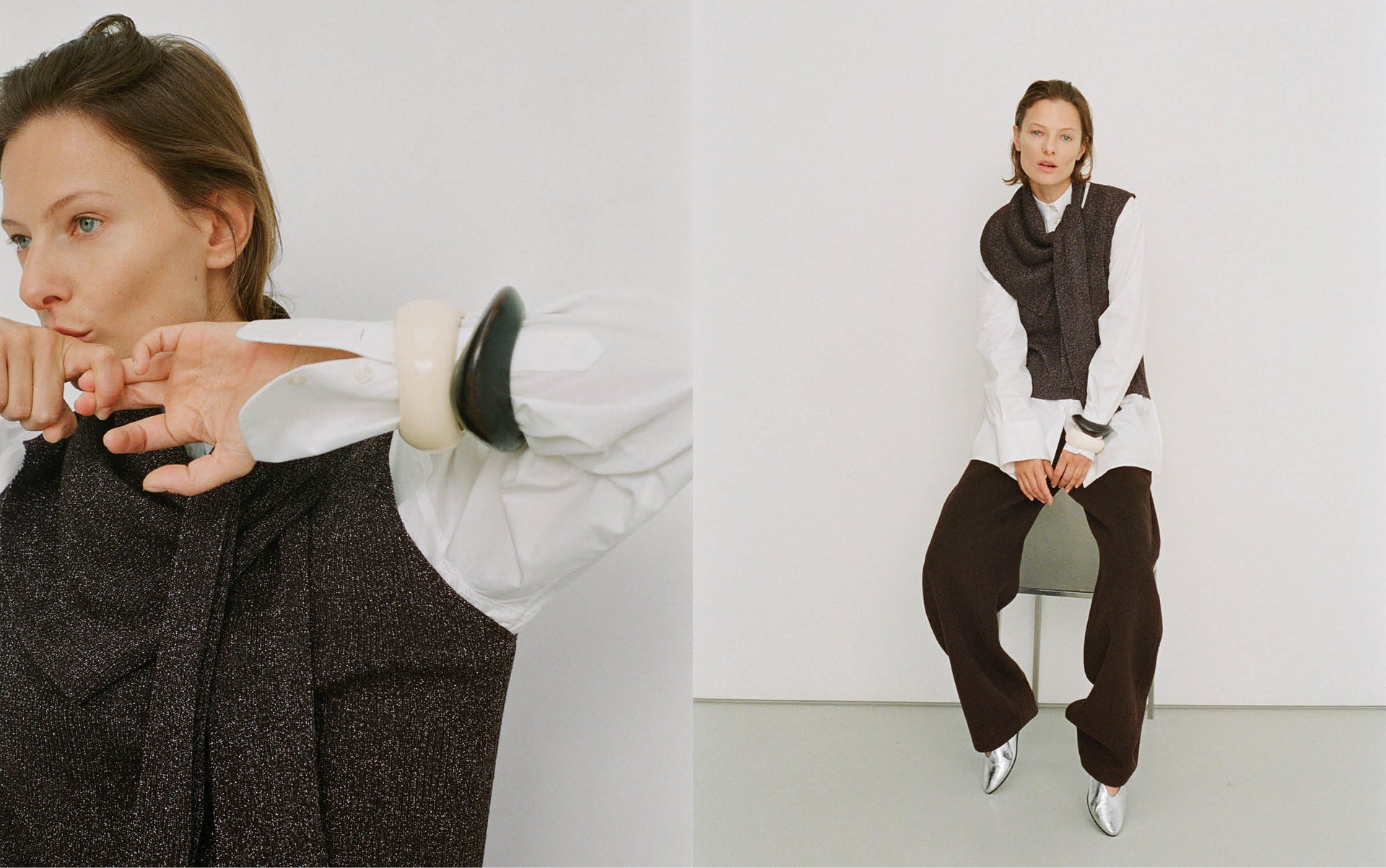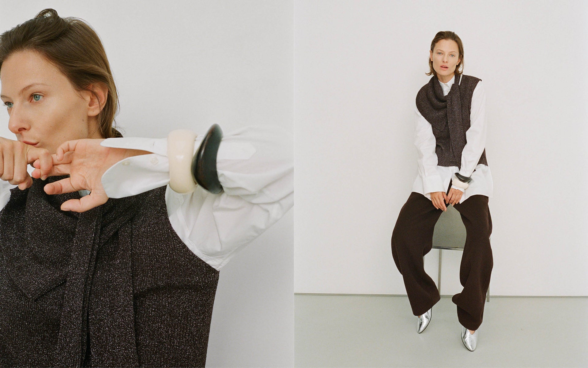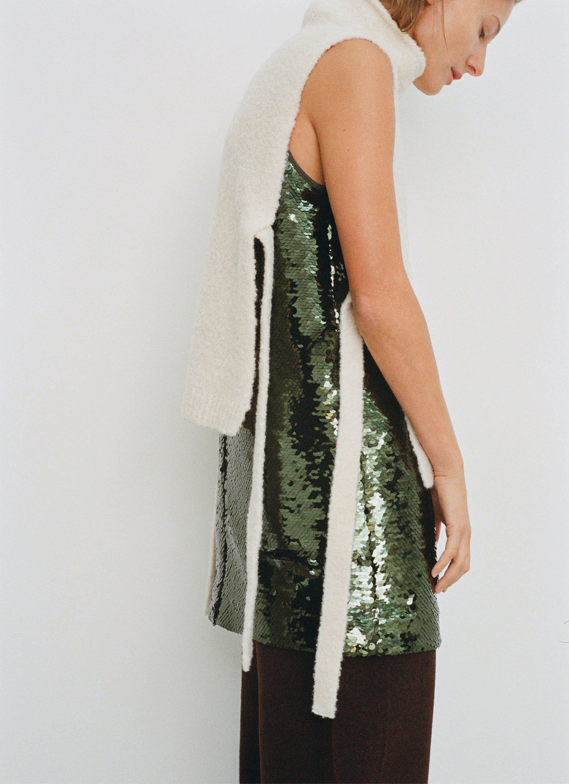 Un jersey marrón de doble cara de elegancia atemporal, un minivestido de lana y alpaca en color crudo o una falda de lentejuelas verde noche.