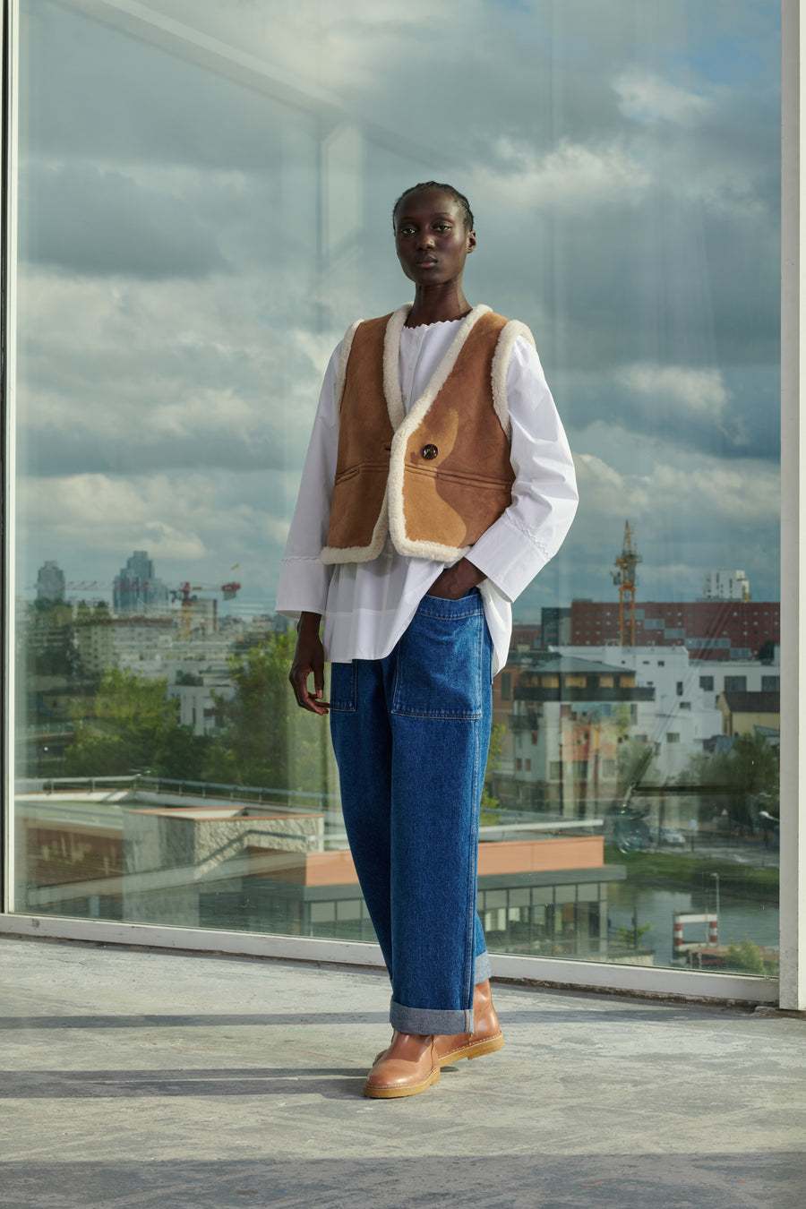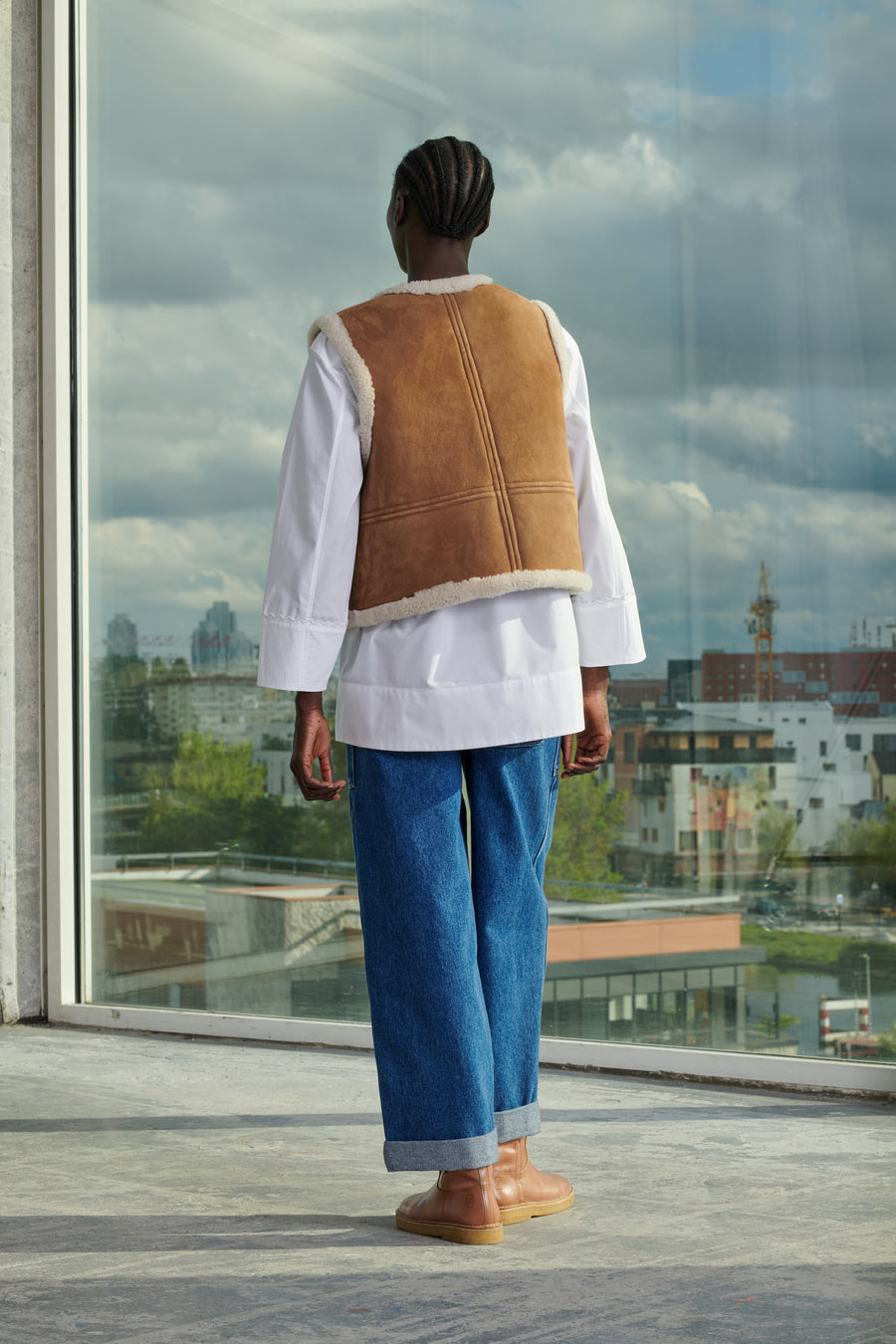 PYRENNES es un chaleco sin mangas en piel de lana natural. Su corte recto está diseñado como un cruzado asimétrico, con apertura abotonada y bolsillos escondidos en la línea de la cintura. Su lana de cordero es especialmente cálida.