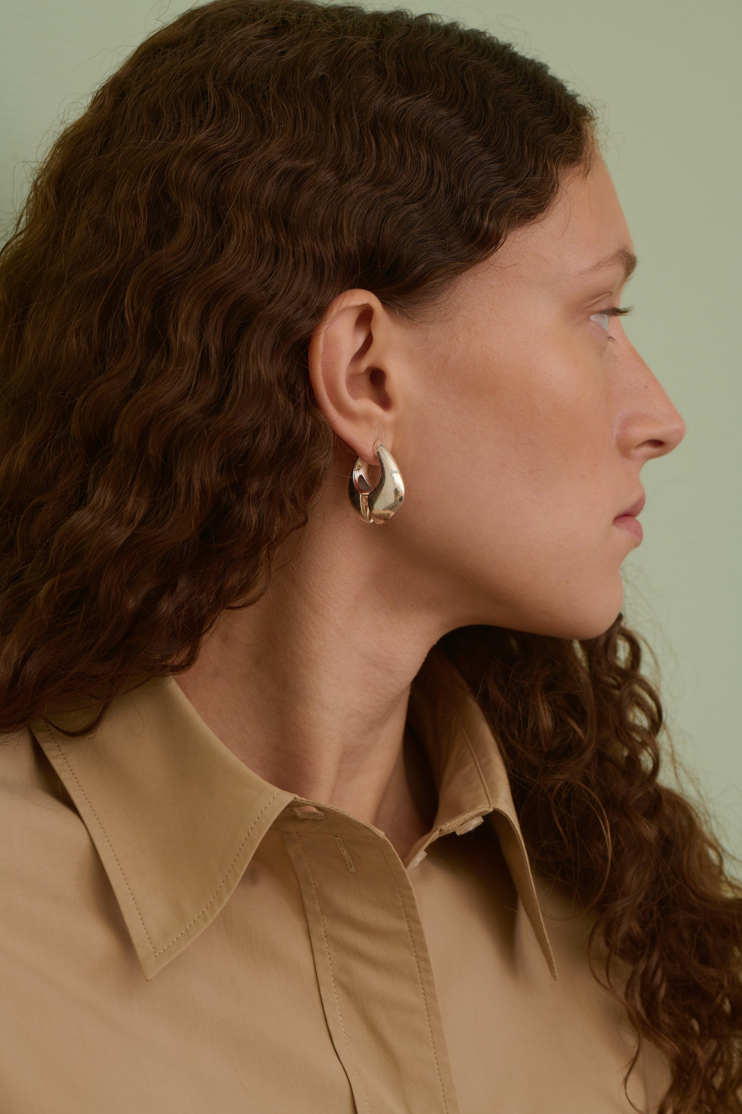 La línea MOON se define por un diseño escultural y redondeado, roto en algunos puntos como para aligerar sus formas. La colección incluye una pulsera brazalete para llevar sobre un jersey, un anillo macizo y pendientes en dos tamaños.