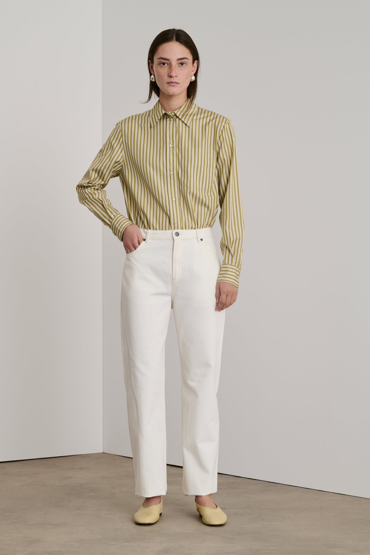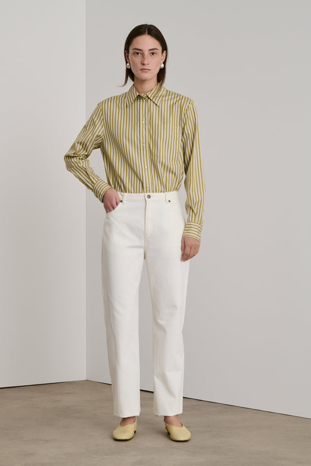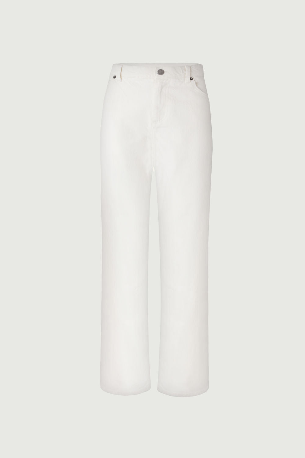 BARNABE es un jean atemporal de corte "girlfriend" recto, perfecto para un look moderno y depurado. Ligeramente corto (hasta los tobillos), pierna recta y cintura media, se adapta a todas las siluetas. Esta versión en denim lavado es flexible y cómoda para el uso diario.