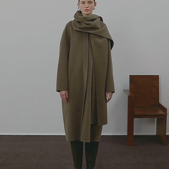 FINN es un abrigo largo en doble faz jaspeado, amplio y a media pantorrilla. Su escote redondo y la tapeta de botones añaden un toque de sofisticación. Los bolsillos discretos y la bufanda removible aportan confort y calor, perfecto para el invierno. Un abrigo elegante y versátil.