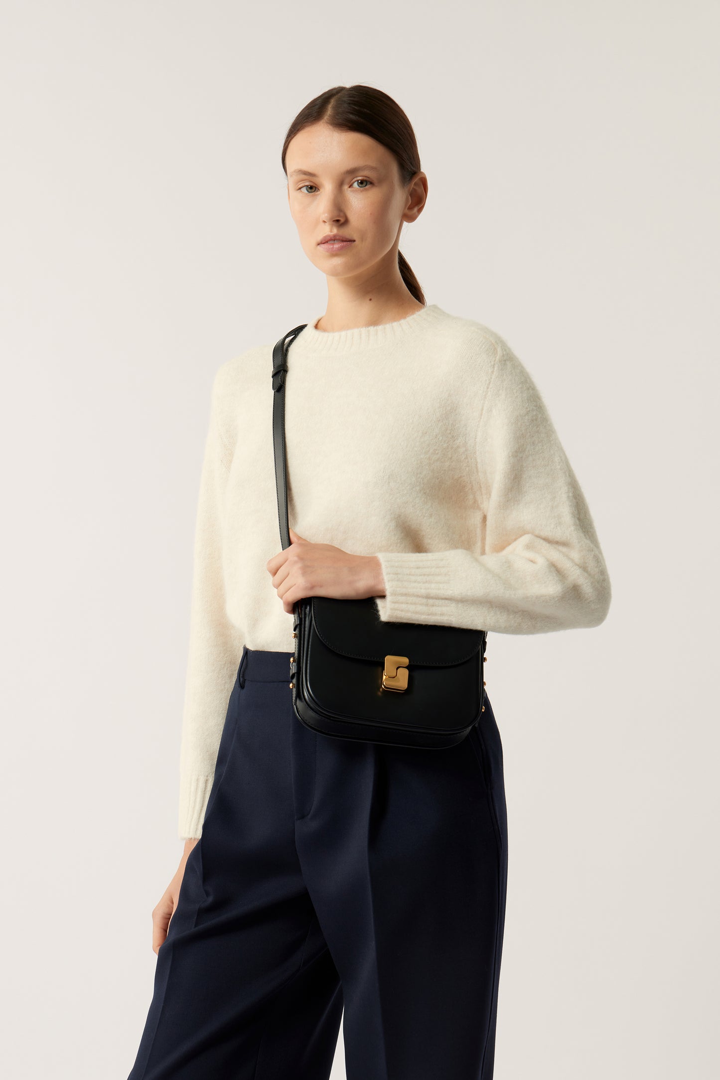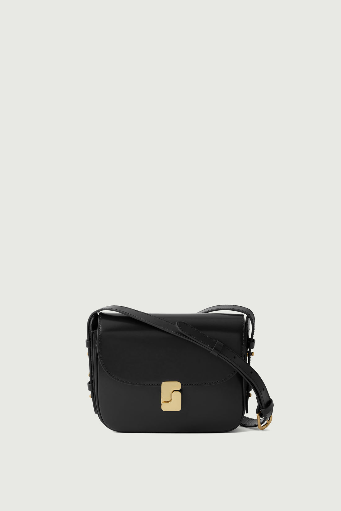 Mini bolso en cuero negro glacé con cierre de monograma dorado