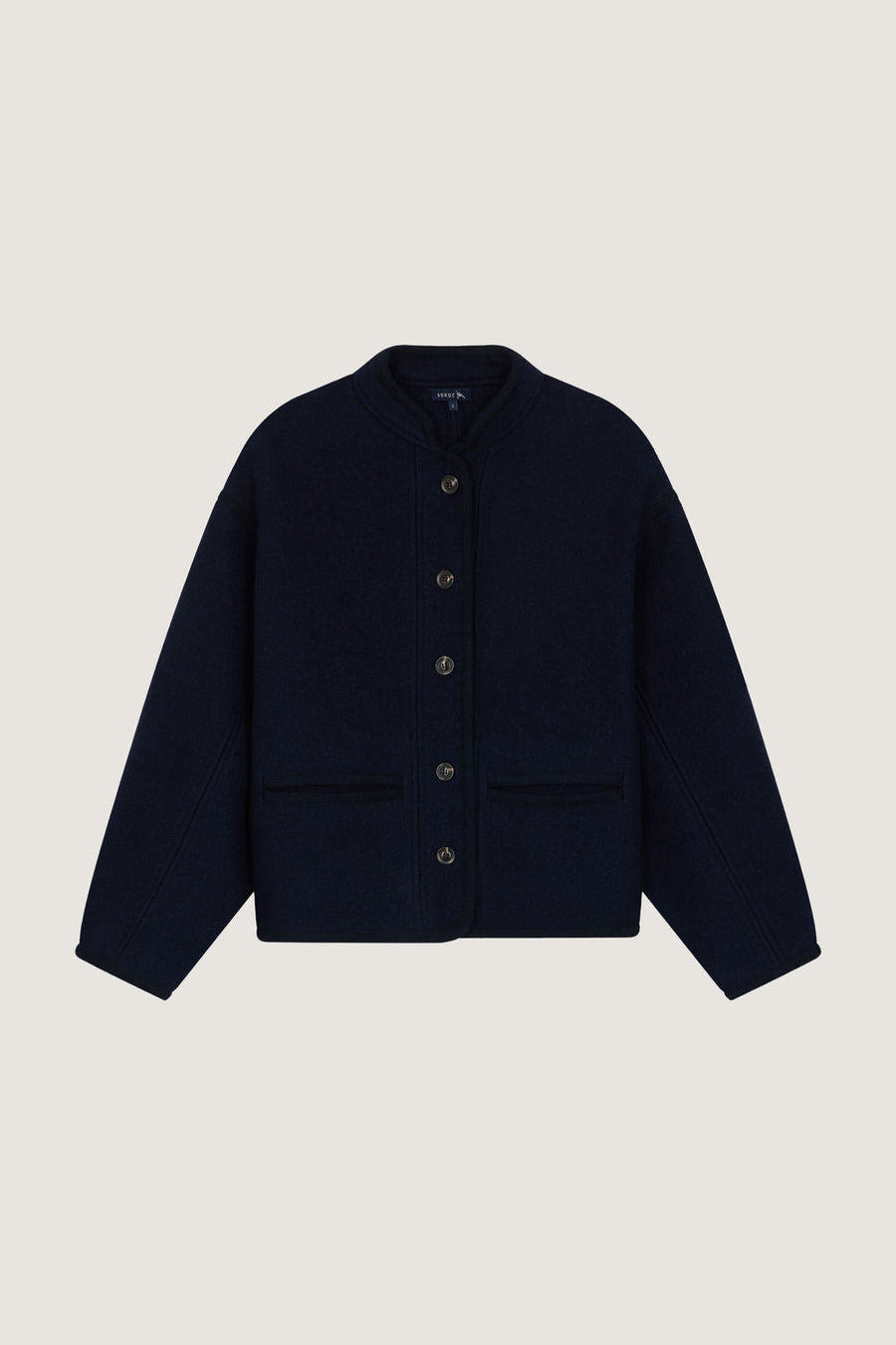 OLYMPE es una chaqueta de lana gruesa, de volumen corto suspendido elegantemente sobre la cintura. Destaca por los códigos de chaqueta austriaca con acabados trenzados. Su lana cálida asegura aislamiento óptimo y tacto agradable. Entre chaleco grueso y chaqueta exterior, ideal para entretiempo.