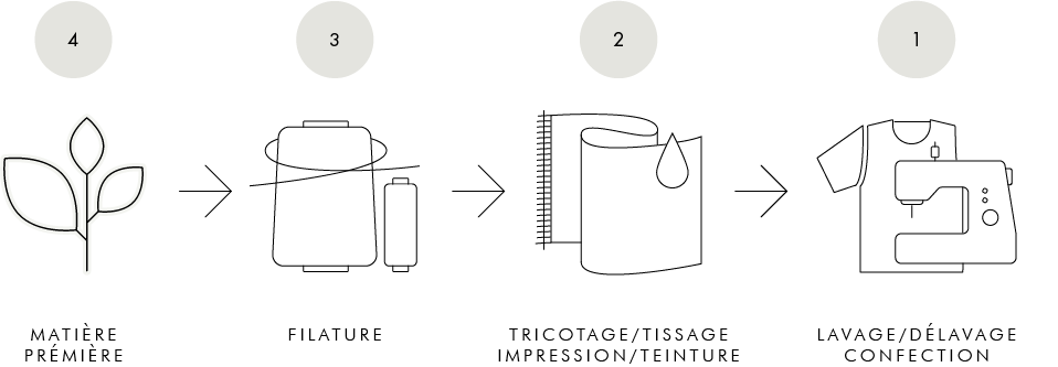 La chaîne de fabrication d’un vêtement est composée de 4 étapes principales : production et extraction des matières premières,