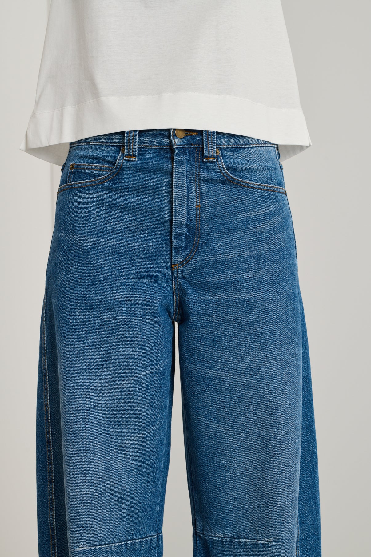 ELIOTT est un jean large à la coupe ample qui s'inscrit déjà comme un incontournable du vestiaire Soeur. Sa jambe résolument arrondie est accentuée par une pince au genou et par une longueur "cropped" sur la cheville qui allonge la silhouette. Cette version en denim bleu est souple et confortable au quotidien.