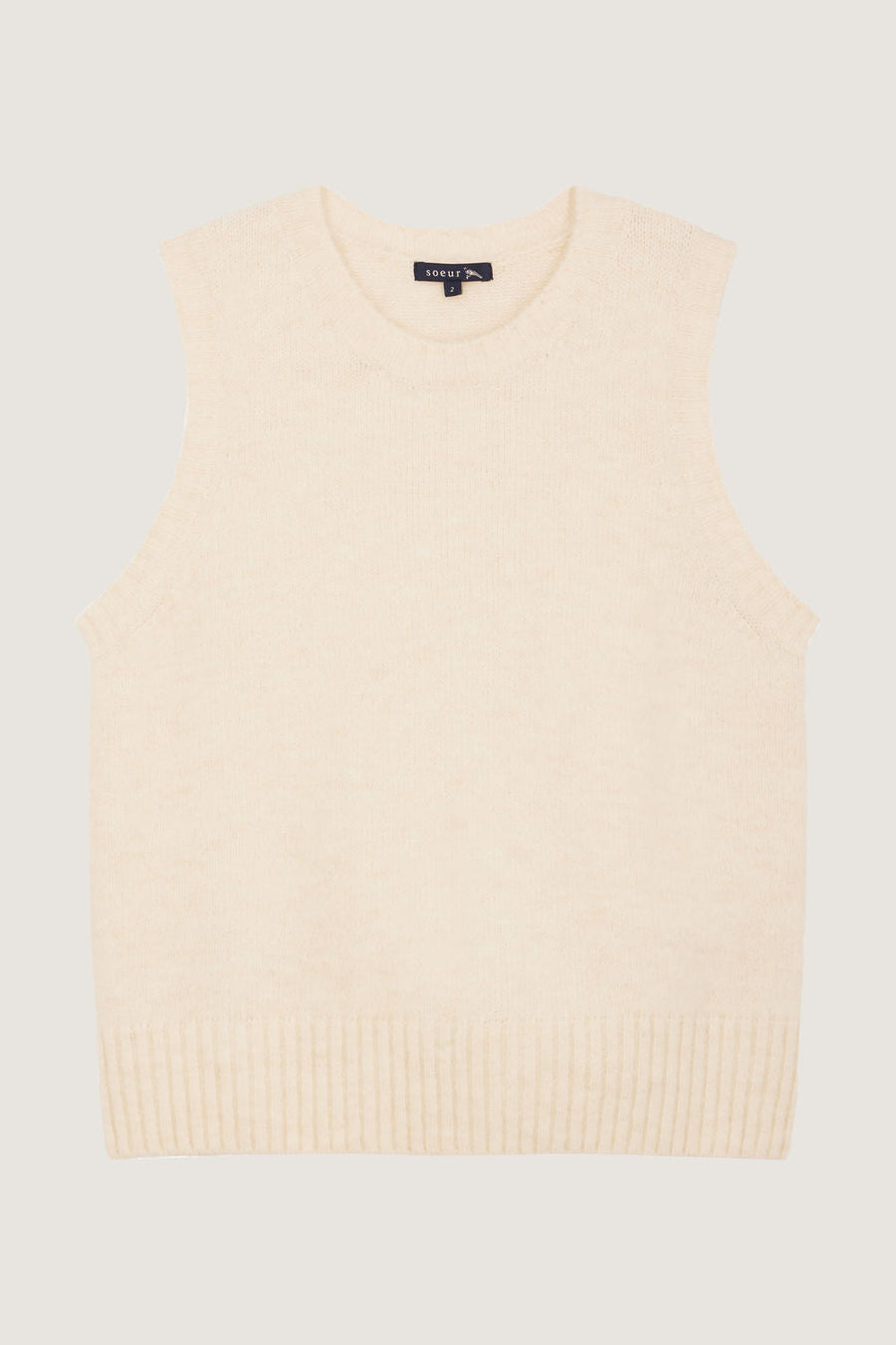 NAMASTE est un pull sans manches en alpaga et laine, souple et confortable, au toucher duveteux. À porter seul ou en superposition. Pratique, il se glisse sous une veste ou un manteau pour réchauffer sans contraindre le mouvement des bras.